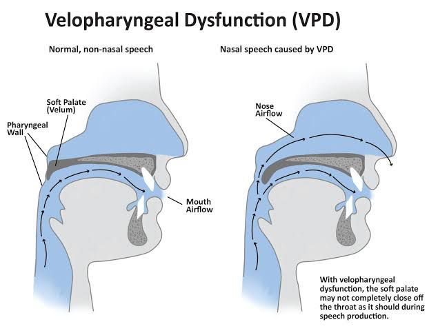The signs and symptoms of VPI include: Nasal-sounding voice. Problems forming certain words or sounds (for example, the consonants p, b, g, t and d). Unexpected sounds coming from your nose during speech. Rarely, regurgitation of liquid or food through your nose.