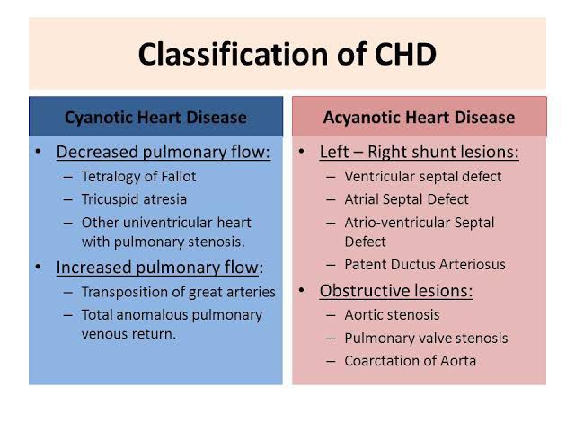Congenital heart disease is broadly classified into cyanotic and acyanotic types.