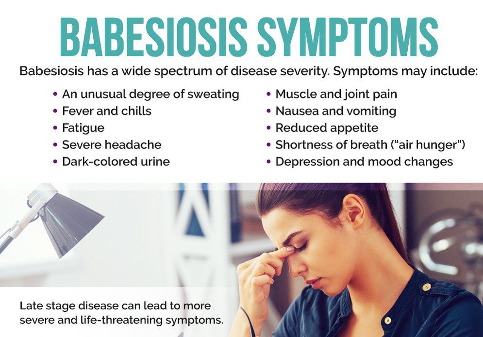 What are the symptoms and signs of Babesia infection? Many people who are infected with Babesia microti feel fine and do not have any symptoms. Some people develop flu-like symptoms, such as fever, chills, sweats, headache, body aches, loss of appetite, nausea, or fatigue.