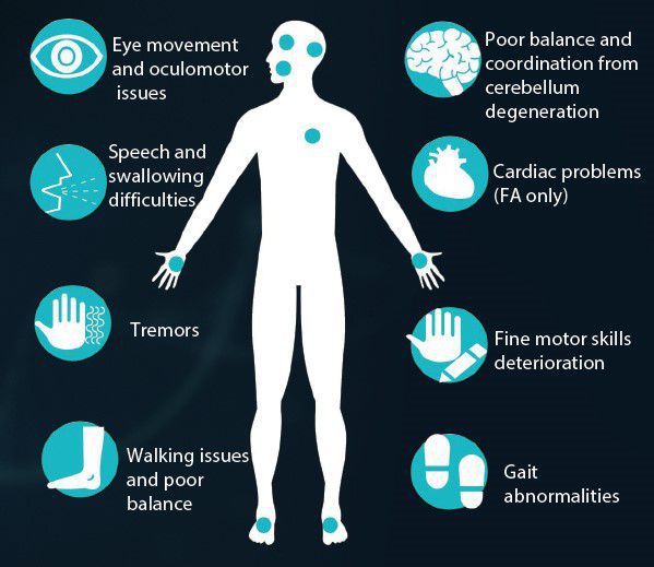 Ataxia means without coordination. People with ataxia lose muscle control in their arms and legs. This may lead to a lack of balance, coordination, and trouble walking. Ataxia may affect the fingers, hands, arms, legs, body, speech, and even eye movements.