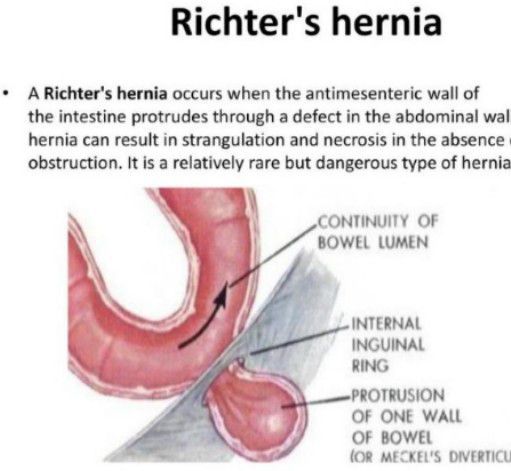 A Richter hernia occurs when the anti-mesenteric wall of the intestine protrudes, causing strangulation without obstruction. 2. They are most commonly diagnosed in patients 60 to 80 years of age and comprise up to 10 percent of all strangulated hernias