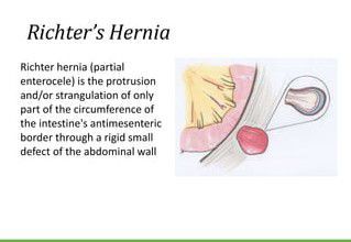Richter hernia is a herniation of the anti-mesenteric portion of the intestine through a fascial defect. Patients often present with symptoms similar to other incarcerated hernias, such as abdominal discomfort, distention, nausea, and vomiting.