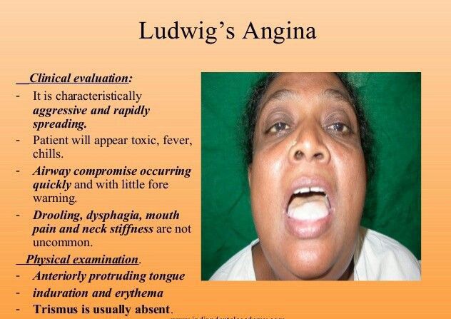 Symptoms of Ludwig's angina The symptoms include swelling of the tongue, neck pain, and breathing problems. Ludwig's angina often follows a tooth infection or other infection or injury in the mouth. The symptoms include: pain or tenderness in the floor of your mouth, which is underneath your tongue.