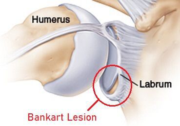 A glenoid labrum tear in the anterior joint is called a Bankart lesion. When the labrum is torn, the shoulder joint is less stable, and allows the humeral head to move around more than normal. Posterior dislocation (when the arm is forced backwards) can also lead to a tear in the labrum, though less commonly