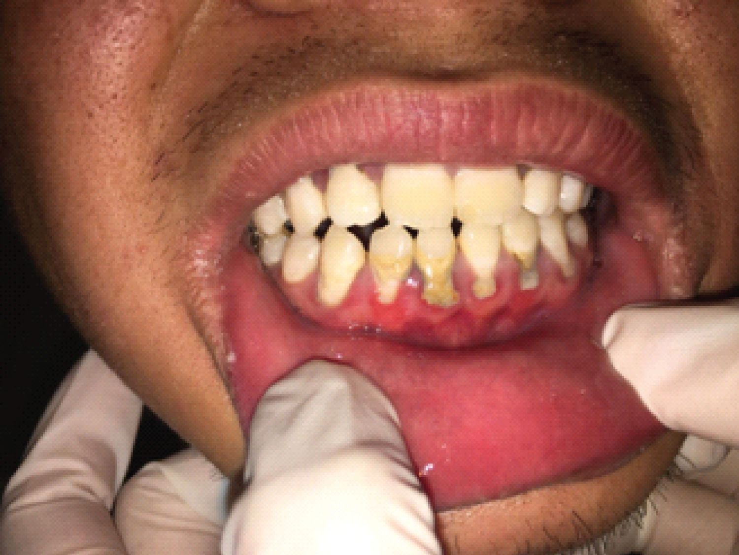 Symptoms of ANUG include: Painful gums. Profuse gum bleeding in response to any pressure or irritation. Gums appear reddened and swollen. Grayish film on the gums. Crater-like ulcers between the teeth. Bad breath. Foul taste.