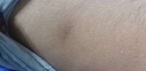 I have something like this but on my low back right side. I've had it for 3 years it has gotten bigger and spread. It burns, itches and hurts when pressure is put on it I wish I could post the picture to compare it looks bruised until it flares up when I do any lifting or excessive walking or standing then its big odd shaped bumps under my skin. I've been to several different doctors over the years and have not been able to figure out what it is or what to do about it. I google searched my picture and this was the closest to my issue