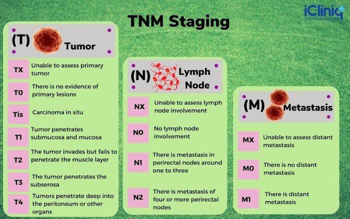 Doctors use the TNM staging system for most types of cancer. The TNM system uses letters and numbers to describe the tumor (T), lymph nodes (N), whether or not the cancer has spread or metastases (M). Each letter and number tell you something about the cancer. The specific definitions for each category are different for each type of cancer that is staged using this system. Learn more specific staging information for each type of cancer. Tumor (T): The letter T and the number after it describe the tumor by answering these questions: How large is the primary tumor? Does it go into other tissues or organs in the same area? Where is it located? The letter T is followed by a letter, number, or combination of letters after it. This gives additional information about the tumor. The different letters and numbers that may see include: TX means that there is no information about the tumor or it cannot be measured. T0 means that there is no evidence of a tumor. Tis refers to a tumor "in situ." This means that the tumor is only found in the cells where it started. It has not spread to any surrounding tissue. T1-T4 describe the size and location of the tumor, on a scale of 1 to 4. A larger tumor or a tumor that has grown deeper into nearby tissue will get a higher number. For some types of cancer, the T stage can be broken down into subcategories for even more detail. This is noted with a lowercase letter, like an "a" or "b", such as "T2b". What these letters mean depends on the type of cancer. A lowercase "m" can also be used to show that there are multiple tumors. Node (N): The letter N and the number after it describe if cancer has affected the lymph nodes. The lymph nodes are small, bean-shaped organs that help fight infection. They are a common spot where cancer first spreads. This part of the staging system answers these questions: Has the tumor spread to the lymph nodes? If so, which lymph nodes and how many? Lymph nodes near where the cancer started are called regional lymph nodes. Lymph nodes in other parts of the body are called distant lymph nodes. The N category only refers to lymph nodes near the cancer (regional lymph nodes). Distant lymph nodes elsewhere in the body are included in the "M" category (see below). After the letter N, there will be a number from 0 (zero) to 3. N0 means there are no lymph nodes with cancer. Most often, the more lymph nodes with cancer, the larger the number. But for some tumors, the location of the lymph nodes with cancer may determine the "N" category. Metastasis (M): The letter M and the number after it describes if the cancer has spread. It answers these questions: Has the cancer spread to other parts of the body? If so, where and how much? If cancer has not spread, the stage is M0. If the cancer has spread to other parts of the body, it is stage M1.