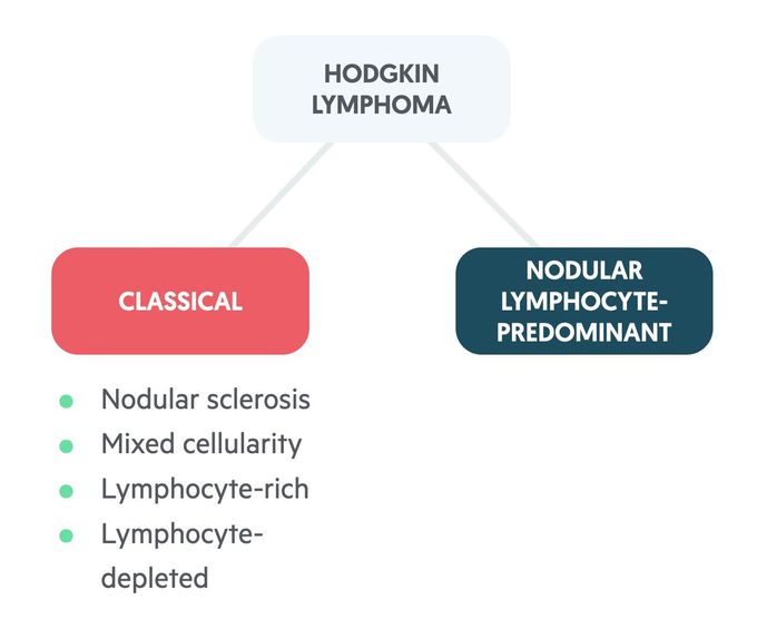 The World Health Organization (WHO) divides Hodgkin lymphoma into two main subtypes. They are: Classical Hodgkin lymphoma. Nodular lymphocyte-predominant Hodgkin lymphoma.