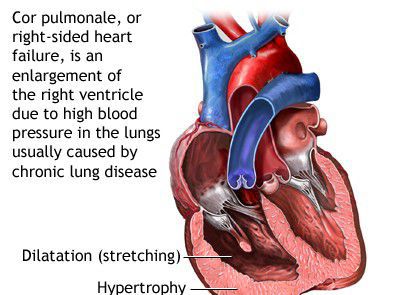Cor pulmonale is a condition that causes the right side of the heart to fail. Long-term high blood pressure in the arteries of the lung and right ventricle of the heart can lead to cor pulmonale