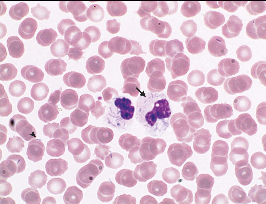 A 62-year-old man presented to the emergency department with a 1-day history of fever and a 3-day history of chest pain. His medical history was notable for coronary heart disease and for a splenectomy that he had undergone after a car accident. Four days before presentation, he had been bitten on the left hand by his dog and had sustained three bite wounds. Laboratory studies showed a white-cell count of 16,700 per cubic millimeter (reference range, 3900 to 10,200), a platelet count of 31,000 per cubic millimeter (reference range, 150,000 to 370,000), and a procalcitonin level of more than 100 μg per liter (reference value, ≤0.05). Blood cultures were obtained, and treatment with broad-spectrum antibiotic agents, intravenous fluids, and norepinephrine was initiated. Review of a peripheral-blood smear showed the presence of both intracellular (arrow) and extracellular (arrowhead) bacilliform bacteria. Capnocytophaga canimorsus was cultured after 17 hours. C. canimorsus is part of the oral flora of healthy cats and dogs and can be transmitted to humans through animal bites. The bacterium can cause particularly severe infection in patients with a history of splenectomy. Despite treatment, the patient died 2 days after admission.