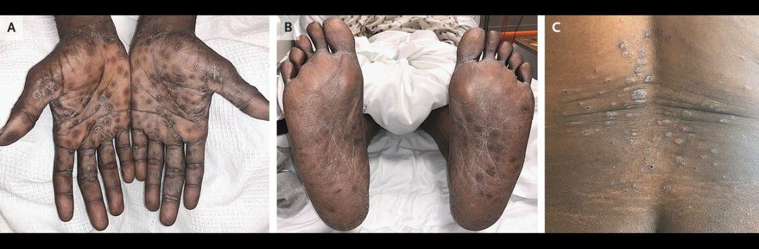 A 62-year-old man presented to the emergency department with a 2-week history of generalized weakness and a diffuse rash. On examination he had a temperature of 38.1°C (100.6°F). Physical examination showed a maculopapular, hyperpigmented, and scaly eruption on his palms (Panel A), soles (Panel B), and trunk (Panel C). There were also hypopigmented plaques on the genitals. He had a history of unprotected intercourse with multiple partners but had not noted the presence of chancres or genital ulcerations. A rapid plasma reagin test was conducted and revealed an elevated titer of 1:128. A fluorescent treponemal antibody absorption test was reactive. Testing for human immunodeficiency virus was negative. A diagnosis of secondary syphilis was made. Primary infection may be asymptomatic; an initial, painless chancre may go unnoticed. The patient was treated with intramuscular penicillin G benzathine and at follow-up 3 months later had complete resolution of the rash and a reduced rapid plasma reagin titer of 1:32.