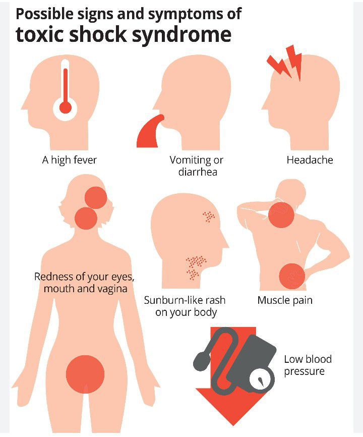 Toxic shock syndrome a high temperature. flu-like symptoms, such as a headache, feeling cold, feeling tired or exhausted, an aching body, a sore throat and a cough. feeling and being sick. diarrhoea. a widespread sunburn-like rash. lips, tongue and the whites of the eyes turning a bright red. dizziness or fainting.