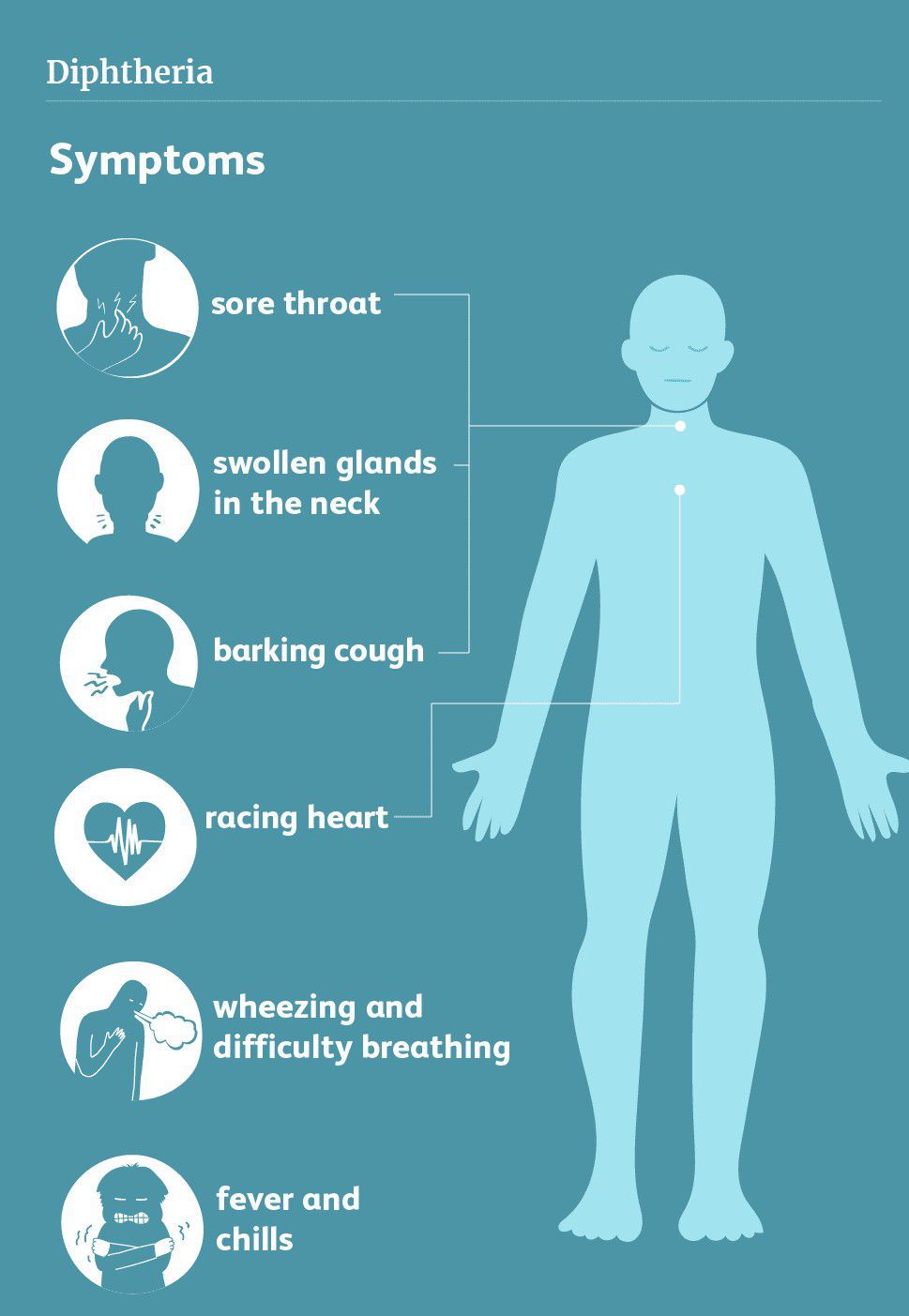 Symptoms of diphtheria include: a thick grey-white coating that may cover the back of your throat, nose and tongue. a high temperature (fever) sore throat. swollen glands in your neck. difficulty breathing and swallowing.