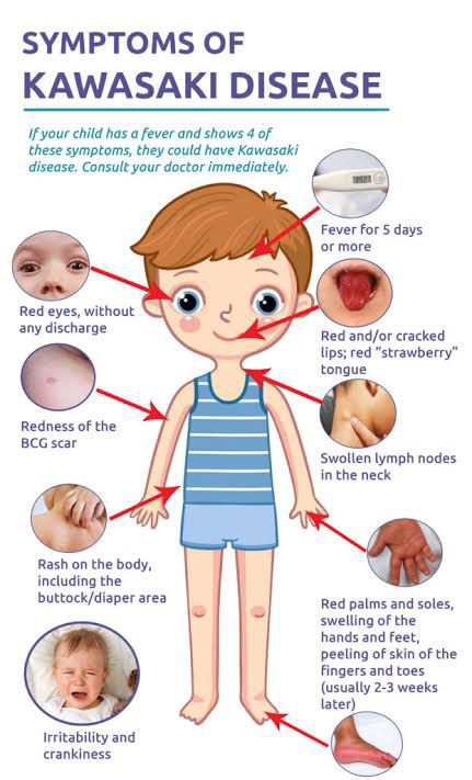 Kawasaki disease is a condition that mainly affects children under the age of 5. It's also known as mucocutaneous lymph node syndrome. A child with Kawasaki disease has a high temperature that lasts for 5 days or longer, and possibly 1 or more of the following symptoms: a rash. swollen glands in the neck.