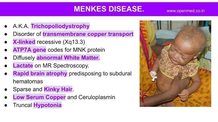Babies with Menkes disease may be born prematurely (early). At birth, they usually seem healthy. The first symptoms start to appear at about 2 to 3 months of age and may include: Kinky hair (crinkly hair) that’s light-colored, white or gray and breaks easily. Floppy muscle tone (hypotonia). Low body temperature (hypothermia). Saggy facial features. Seizures (epilepsy). Slow growth and weight gain (failure to thrive). Yellowish skin and eyes (jaundice). Symptoms vary from person to person. Symptoms may appear later in childhood or early adulthood, though only in rare cases.