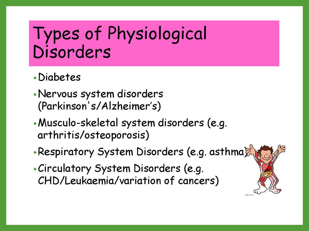 A physiological disorder is a condition in which the organs in the body malfunction causes illness. Examples are Asthma, Glaucoma, Diabetes. Anxiety disorders, including panic disorder, obsessive-compulsive disorder, and phobias. Depression, bipolar disorder, and other mood disorders. Eating disorders. Personality disorders. Post-traumatic stress disorder. Psychotic disorders, including schizophrenia.