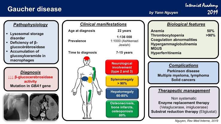 Gaucher disease is an inherited condition (passed down through families). It is a lysosomal storage disorder, a type of disease that causes fatty substances to build up in the bone marrow, liver and spleen. The fatty substances (sphingolipids) weaken bones and enlarge the organs, so they can’t work like they should. There is no cure for Gaucher disease, but treatments can relieve symptoms and greatly improve quality of life.
