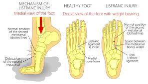 Lisfranc injuries — whether or not you have a fracture — often have the following symptoms on or near the top of your foot: Pain. Swelling, especially near the inside edge (instep). Bruising (can also appear on the bottom of your foot). You can’t put much or any weight on your foot: Even if you can put some weight on your foot, if you feel any discomfort, you might still have a Lisfranc injury.