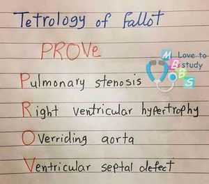1.Pulmonary stenosis π(narrowing of pulmonary vavle) 2.R.V hypertrophy π(enlargement of R . ventricular) 3.Overriding aortaπ(blood from both V to enter the aorta) 4.Ventricular septal defectπ(a hole between the 2 V)