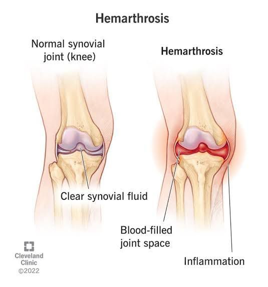 Bleeding into a joint is referred to as hemarthrosis and is an important cause of monoarticular joint pain and swelling. Hemarthrosis may be suspected on the basis of a suggestive history, physical examination, or imaging studies, but definitive diagnosis usually requires joint aspiration