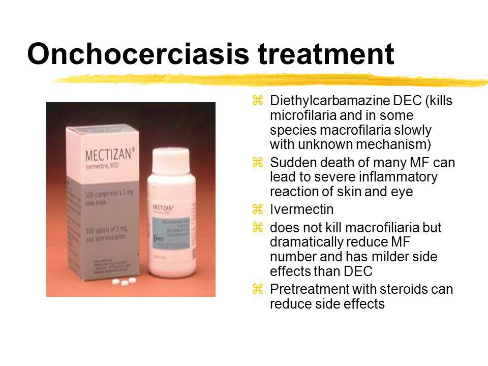 The recommended treatment is ivermectin, which will need to be given every 6 months for the life span of the adult worms (i.e., 10–15 years) or for as long as the infected person has evidence of skin or eye infection. Ivermectin kills the larvae and prevents them from causing damage but it does not kill the adults.