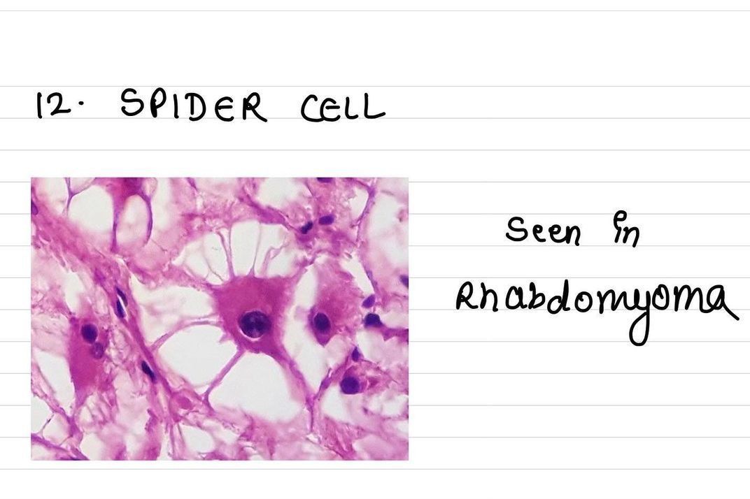 There are large, rounded polygonal cells with strands of cytoplasm interspersed among glycogen-rich vacuoles – “spider cells”. This tumor is sometimes part of a hamartomatous syndrome, tuberous sclerosis. A tumor of fetuses and infants, this pathologically benign lesion can kill due to obstruction. https://www.brown.edu