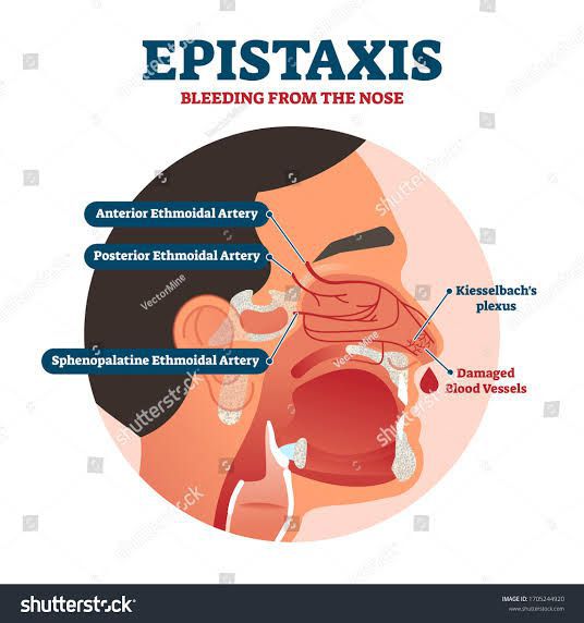 Follow these steps to stop a nosebleed: Relax. Sit upright and lean your body and your head slightly forward. This will keep the blood from running down your throat, which can cause nausea, vomiting, and diarrhea. (Do NOT lay flat or put your head between your legs.) Breathe through your mouth. Use a tissue or damp washcloth to catch the blood. Use your thumb and index finger to pinch together the soft part of your nose. Make sure to pinch the soft part of the nose against the hard bony ridge that forms the bridge of the nose. Squeezing at or above the bony part of the nose will not put pressure where it can help stop the bleeding. Keep pinching your nose continuously for at least 5 minutes (timed by clock) before checking if the bleeding has stopped. If your nose is still bleeding, continue squeezing the nose for another 10 minutes. If you’d like, apply an ice pack to the bridge of your nose to further help constrict blood vessels (which will slow the bleeding) and provide comfort. This is not a necessary step, but you can try this if you want. You can spray an over-the-counter decongestant spray, such as oxymetazoline (Afrin®, Dristan®, Neo-Synephrine®, Vicks Sinex®, others) into the bleeding side of the nose and then apply pressure to the nose as described above. WARNING: These topical decongestant sprays should not be used over a long period of time. Doing so can actually cause an increase in the chance of a nosebleed. After the bleeding stops, DO NOT bend over, strain and/or lift anything heavy. DO NOT blow or rub your nose for several days.