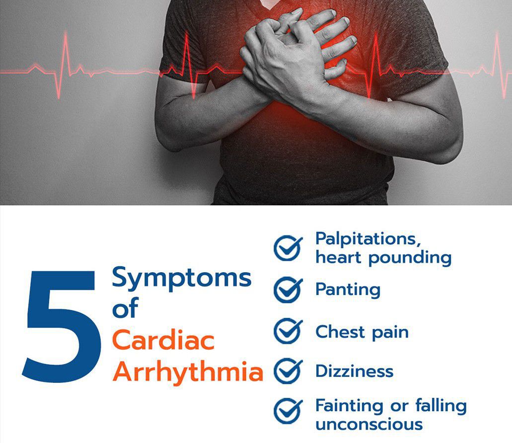 In general, signs and symptoms of arrhythmias may include: A fluttering in the chest. A racing heartbeat (tachycardia) A slow heartbeat (bradycardia) Other symptoms may include: Anxiety. Fatigue. Lightheadedness or dizziness. Sweating. Fainting (syncope) or near fainting.