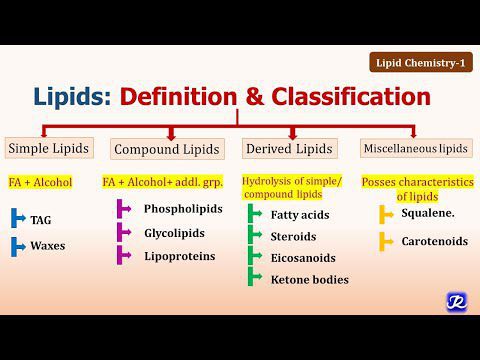 The video defines lipids and gives a brief review of its classes. Simple lipids, Compound lipids and derived lipids are explained with their relevant examples. Functions and clinical importance of lipids are also described. TIMELINE: 0:00 Introduction 0:23 Definition of lipids 0:44 Classification 1:24 Simple lipids 1:31 Examples of simple lipids 2:23 Compound lipids 2:31 Examples of compound lipids 3:52 Derived lipids 4:00 Examples of derived lipids 4:26 Miscellaneous lipids 4:33 Examples of miscellaneous lipids 4:40 Functions of lipids 5:48 Clinical importance of lipids