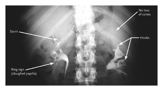 Many conditions and factors can cause renal papillary necrosis. The most common are: Diabetes. Overuse of nonsteroidal anti-inflammatory drugs (NSAIDs) such as aspirin, ibuprofen and naproxen. Sickle cell disease. Other conditions and diseases that can lead to renal papillary necrosis include: Chronic liver disease. Pyelonephritis, a bacterial infection of your kidney. Renal tuberculosis, a form of tuberculosis found outside of your lungs. Renal vein thrombosis, a blood clot in the vein that carries blood away from your kidneys. Ureteral obstruction, blockage of your ureter. Vasculitis, inflammation of blood vessels.