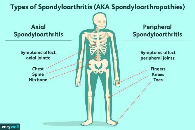 How many types of spondyloarthritis are there? These conditions are currently grouped into two overlapping categories: Axial spondyloarthritis, which is characterized by inflammatory pain and arthritis in the spine and hips. Peripheral spondyloarthritis, characterized by inflammatory pain and arthritis in peripheral joints and tendons other than the spine.