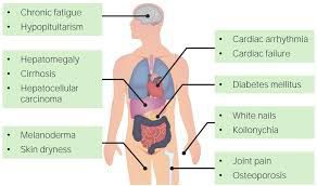 Some people with hemochromatosis never have symptoms. Early symptoms often overlap with those of other common conditions. Symptoms may include: Joint pain. Abdominal pain. Fatigue. Weakness. Diabetes. Loss of sex drive. Impotence. Heart failure. Liver failure. Bronze or gray skin color. Memory fog.
