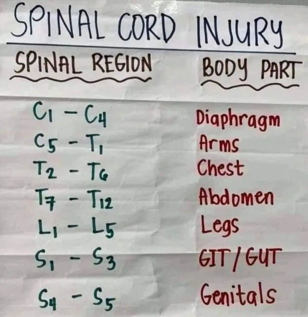 Spinal cord injury at different levels is shown here.