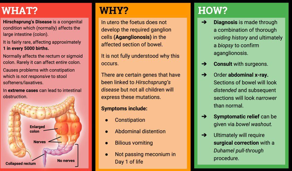 It's not clear what causes Hirschsprung's disease. It sometimes occurs in families and might, in some cases, be associated with a genetic mutation. Hirschsprung's disease occurs when nerve cells in the colon don't form completely. Nerves in the colon control the muscle contractions that move food through the bowels.