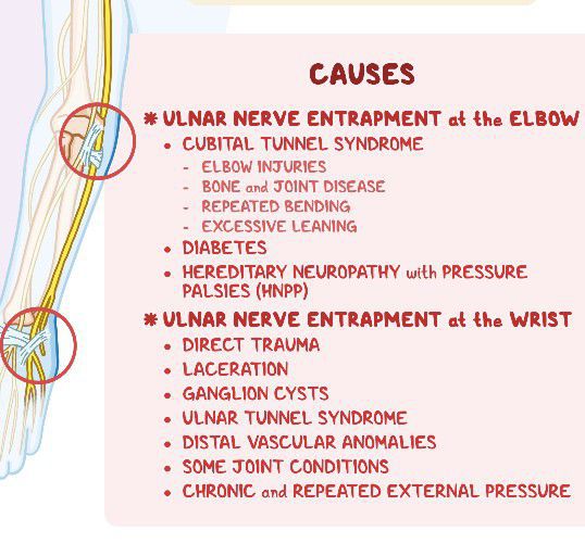 Cubital tunnel syndrome may happen when a person bends the elbows often (when pulling, reaching, or lifting), leans on their elbow a lot, or has an injury to the area. Arthritis, bone spurs, and previous fractures or dislocations of the elbow can also cause cubital tunnel syndrome.
