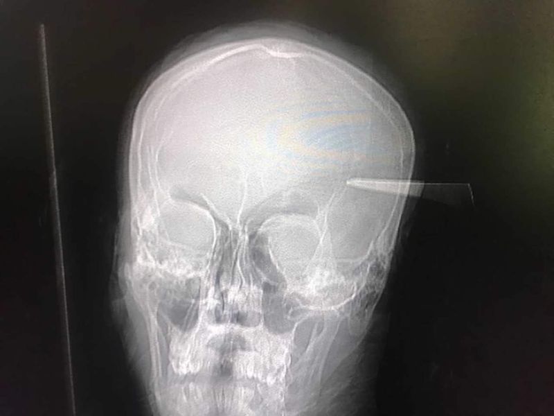 23 year old male presented after being stabbed by his brother in the head for wearing his T-Shirt without permission. Upon presentation his GCS was 15/15 with no neurological deficit. CT-B and CT-Angio suggested no major vascular involvement. Blade was removed with C-Clamp and mallet under general anesthesia with no active bleeding. GCS remained 15/15 post operatively and repeat CT-B revealed no extra-axial or intra-axial bleed or tractoma.