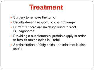 Surgery. Surgery is the only treatment that can cure a glucagonoma. The type of surgery you have depends on the size of the tumour, where it is and whether it has spread to other parts of the body such as the liver.
