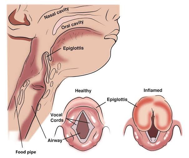 Symptoms in children Children can develop symptoms of epiglottitis within hours. Symptoms can include: Fever. Sore throat. Unusual, high-pitched sound when breathing in, known as stridor. Difficult and painful swallowing. Drooling. Acting anxious and irritable. Sitting up or leaning forward to ease breathing. Symptoms in adults Adults might get symptoms over days rather than hours. Symptoms might include: Sore throat. Fever. A muffled or hoarse voice. Unusual, high-pitched sound when breathing in, known as stridor. Difficulty breathing. Difficulty swallowing. Drooling.