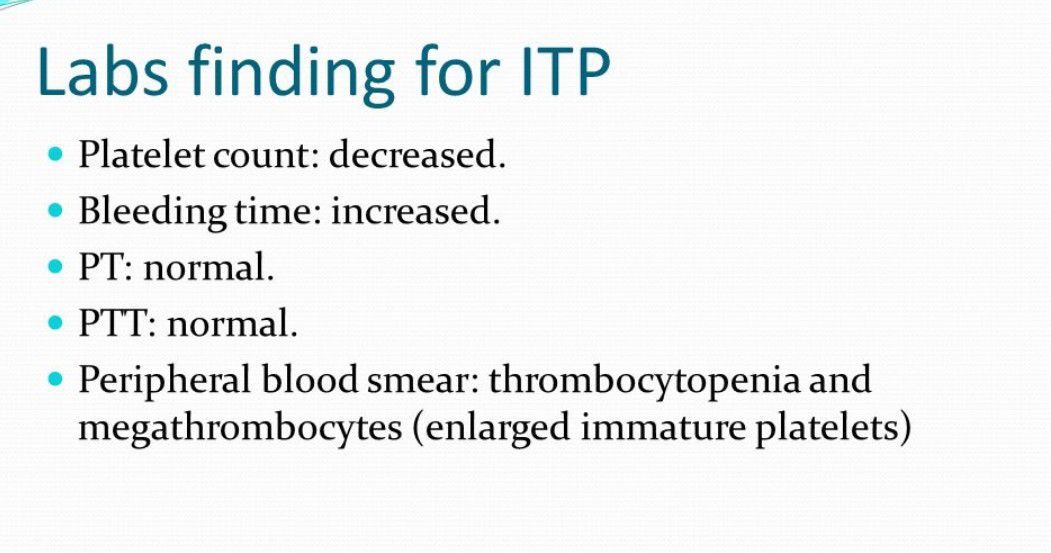 Here are different investigations for idiopathic thrombocytopenic purpura.