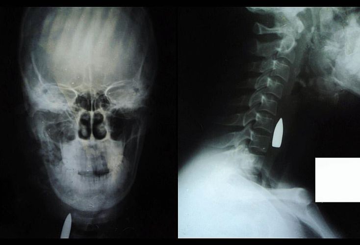 How would you start treating? These head and neck radiographs depict an atypical, accidental AK-47 rifle injury to the right side of the face and neck. The anteroposterior view on the left shows the bullet in the right side of the neck, as well as a comminuted fracture of the mandible (angle and ramus) and maxillary antrum. The lateral radiograph on the right also reveals the bullet lodged in the neck, anterior to the bodies of the cervical vertebrae 6 and 7. Gunshot wounds to the neck are highly likely to cause significant injury. Previously, injuries that violated the platysma muscle were though to require surgical neck exploration; however, because a large number of these neck explorations were ‘’negative’’, advanced imaging in stable patients prior to surgical exploration appears to be a reasonable approach. Cervical spine immobilization is not typically recommended in penetrating neck trauma. However, high-force mechanisms, such as a gunshot wound, make cervical spine injury more likely. Therefore, clinicians should consider immobilizing the cervical spine.