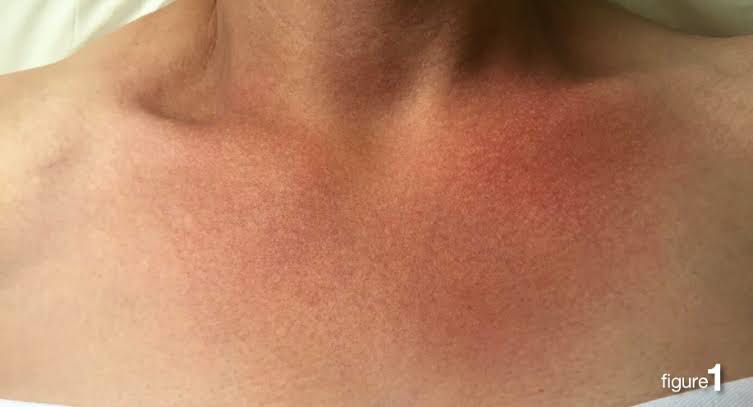 The signs and symptoms of carcinoid syndrome depend on which chemicals the carcinoid tumor secretes into your bloodstream. The most common signs and symptoms include: Skin flushing. The skin on your face and upper chest feels hot and changes color — ranging from pink to purple. Flushing episodes may last from a few minutes to a few hours or longer. Flushing may happen for no obvious reason, though sometimes it can be triggered by stress, exercise or drinking alcohol. Facial skin lesions. Purplish areas of spiderlike veins may appear on your nose and upper lip. Diarrhea. Frequent, watery stools sometimes accompanied by abdominal cramps may occur in people who have carcinoid syndrome. Difficulty breathing. Asthma-like signs and symptoms, such as wheezing and shortness of breath, may occur at the same time you experience skin flushing. Rapid heartbeat. Periods of a fast heart rate could be a sign of carcinoid syndrome.