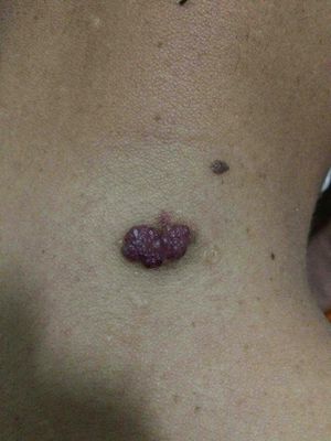The lesion's oozing haemorrhage presents as clusters,vesicles with raised the size,it was appeared when he was a young,Please make a Dx,Rx?