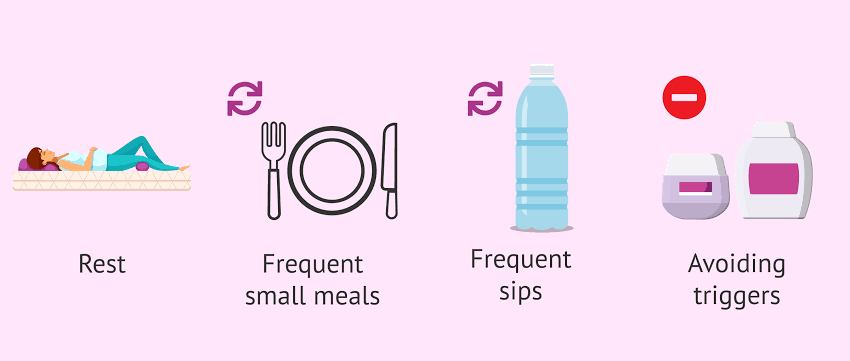 The type of treatment that is required depends on how ill you become. Possible treatments might include: Preventive measures: These might include a pressure-point wristband — similar to those used for motion sickness — vitamin B6 and/or ginger. Small frequent meals: Nausea and vomiting might be treated with dry foods (such as crackers) and small, frequent meals. Intravenous fluids: It is important for a pregnant woman to maintain her fluid intake. Intravenous (IV) fluids might be needed if a woman continues to vomit throughout pregnancy. In severe cases, the woman might require hospitalization and given IV fluids. IV fluids might be discontinued when a woman is able to take in fluids by mouth. Total parenteral nutrition: The most severe cases of hyperemesis gravidarum might require that complex, balanced solutions of nutrients be given through an IV throughout pregnancy. This is called total parenteral nutrition (TPN). Medicines: Medicine to prevent nausea is used when vomiting is persistent and poses possible risks to the mother or baby. If a woman cannot take medicines by mouth, the drugs might be administered through an IV or a suppository. Medicines used to prevent nausea include Promethazine, Meclizine and Droperidol.