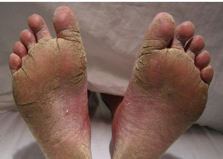 Athlete's foot is typically characterized by skin fissures or scales that can be red and itchy. Tinea pedis is spread through contact with infected skin scales or contact with fungi in damp areas (for example, showers, locker rooms, swimming pools). Tinea pedis can be a chronic infection that recurs frequently