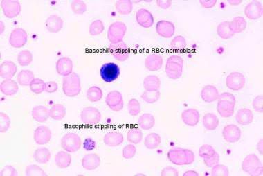 The anemia most often found is a microcytic, hypochromic anemia, but this is likely due to other causes such as iron deficiency. The mechanism of the ring sideroblasts is related to the accumulation of iron-laden mitochondria in the red blood cell precursors due to the inhibition of ferrochelatase by lead.