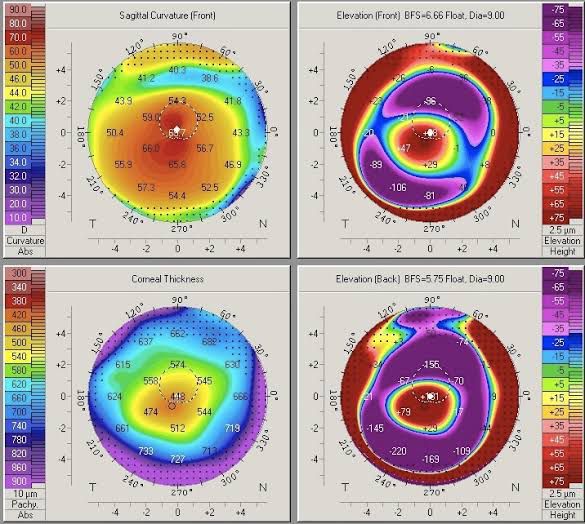 Diagnosis can be made by slit-lamp examination and observation of central or inferior corneal thinning. Computerized videokeratography is useful in detecting early keratoconus and allows following its progression. Ultrasound pachymetry can also be used to measure the thinnest zone on the cornea.