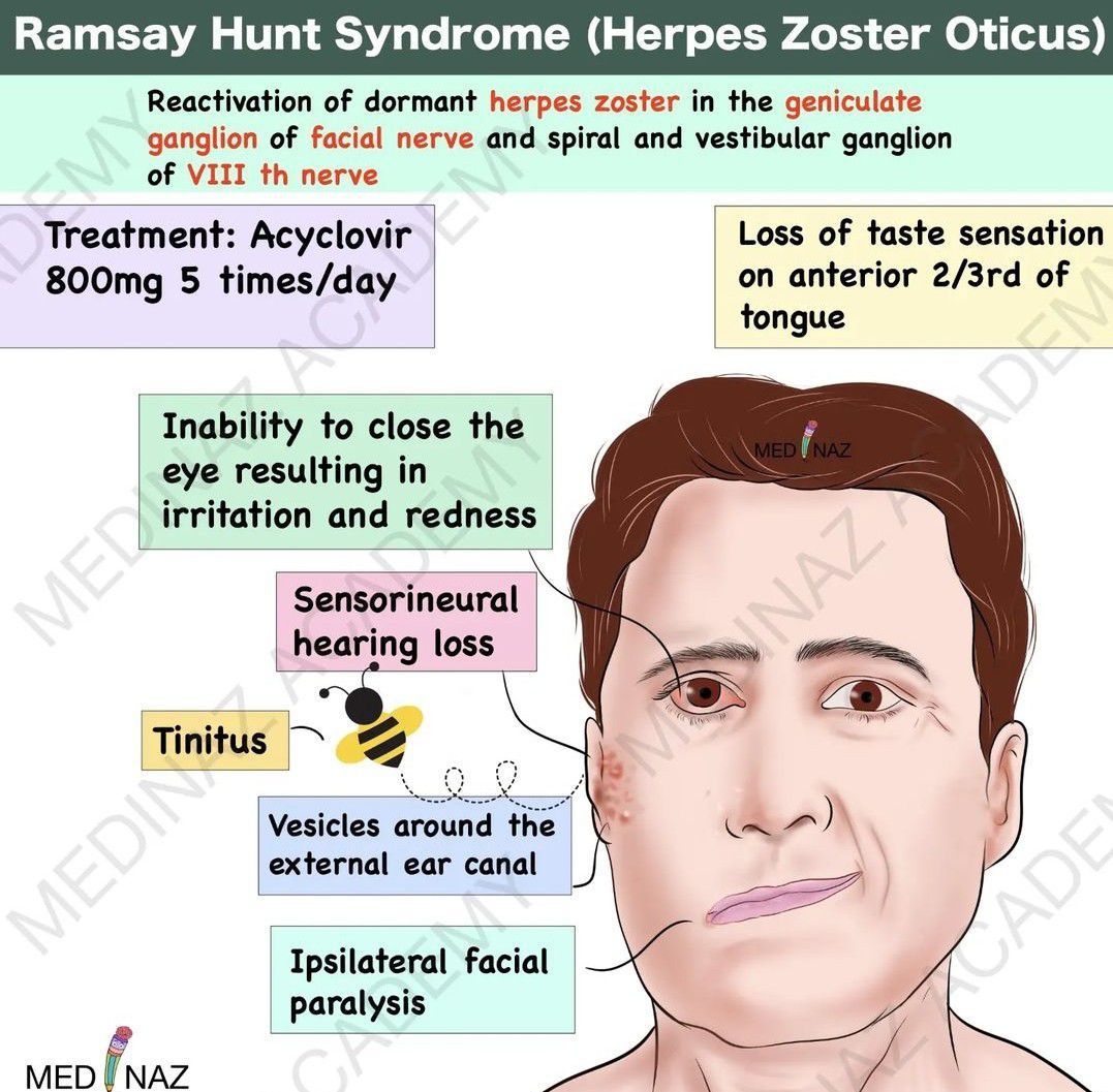 Here are few features of Ramsay Hunt Syndrome. By: https://www.instagram.com/p/CohQqFNheqw/?igshid=NDk5N2NlZjQ=