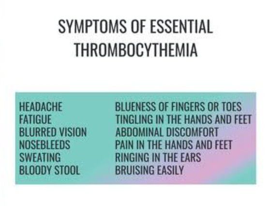 Symptoms of Essential thrombocythemia may include Headache Fatigue Sweating Pain Bloody stool Blur vission