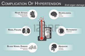 Complication of Hypertension(Heart attack : myocardial infarction , cardiomyopathy )(Brain : stroke , dementia )( visual loss )(Headache)(Renal failure)( Artherosclerosis , aneurysm ) end organ damage