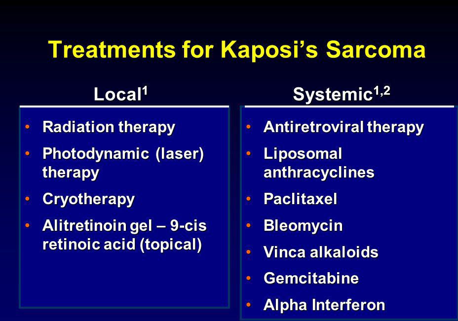 Six types of standard treatment are used to treat Kaposi sarcoma: HAART. Highly active antiretroviral therapy (HAART) is a combination of several drugs used to lessen the damage to the immune system caused by human immunodeficiency virus (HIV) infection. Radiation therapy. Cryosurgery. Chemotherapy. Immunotherapy.